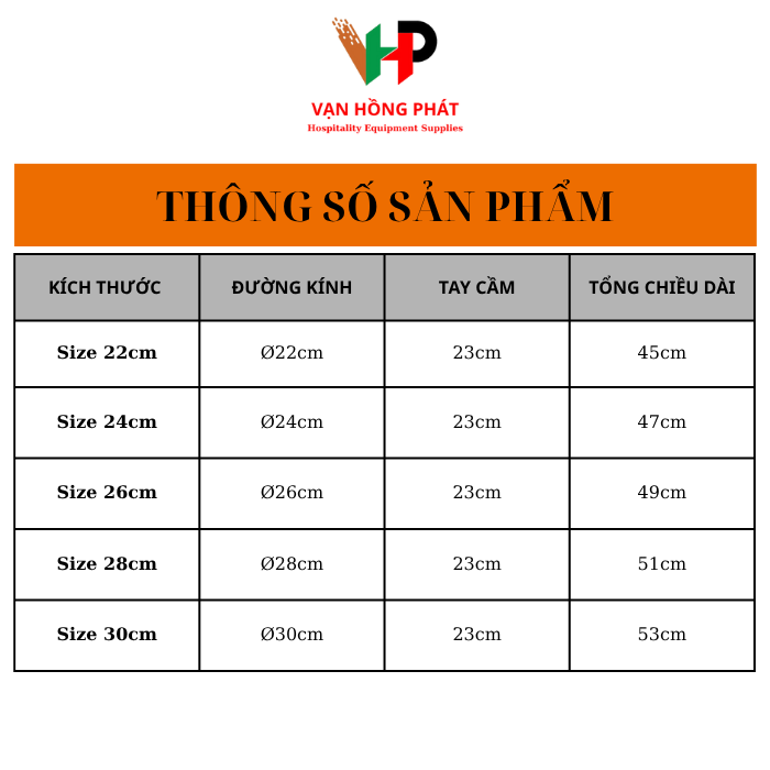 - Size 30cm: Đường kính 30cm – tay cầm 23cm – tổng chiều dài 53cm